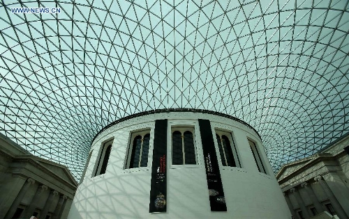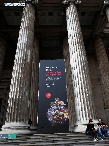 File photo taken on Sept. 15, 2014 shows a poster (L) of an exhibition on antiques of China's Ming Dynasty in British Museum in London, Britain. Chinese President Xi Jinping will pay a state visit to Britain from Oct. 19 to 23. (Xinhua/Han Yan)