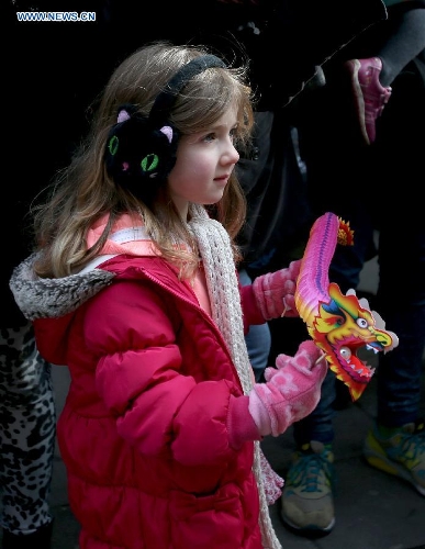 File photo taken on Feb. 22, 2015 shows a British girl watching Chinese lunar New Year celebration parade in London, Britain. Chinese President Xi Jinping will pay a state visit to Britain from Oct. 19 to 23. (Xinhua/Han Yan)