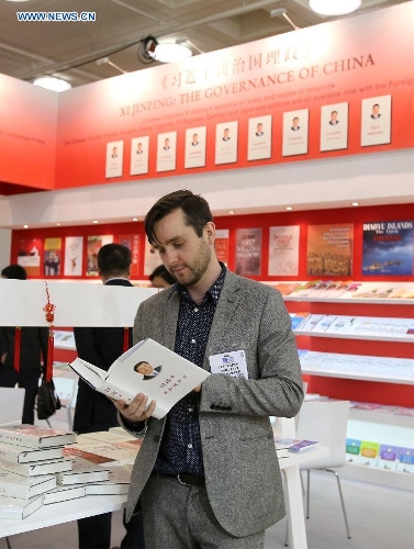 File photo taken on April 14, 2015 shows a man reading the book "Xi Jinping: the Governance of China" at the London Book Fair, Britain. Chinese President Xi Jinping will pay a state visit to Britain from Oct. 19 to 23. (Xinhua/Han Yan)