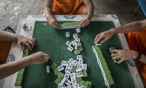 Pa Hanjian, an 11-year-old monk, plays mahjong with his fellow monks in a temple in Menglong town. Photo: George Cheung