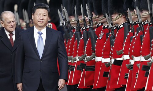 Chinese President Xi Jinping and Britain's Prince Philip, Duke of Edinburgh, inspect the guard of honor on Horse Guards Parade in central London on Tuesday during the ceremonial welcome for Xi and his wife Peng Liyuan on the first official day of his state visit. Photo: AFP