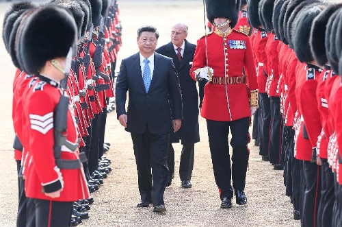 Chinese President Xi Jinping, accompanied by Prince Philip, inspects the guard of honor during a traditional ceremonial welcome held by British Queen Elizabeth II at the Horse Guards Parade in London, Britain, Oct. 20, 2015. (Xinhua/Pang Xinglei)