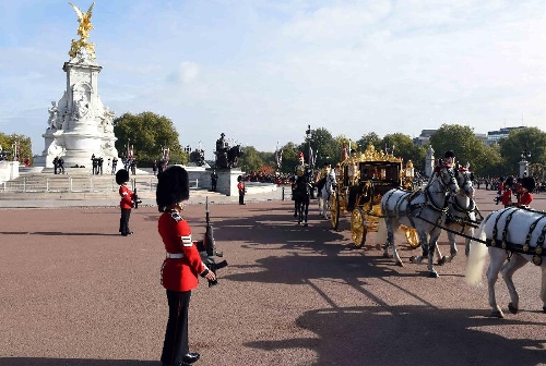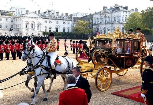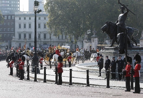 Chinese President Xi Jinping and British Queen Elizabeth II ride a carriage to Buckingham Palace in London, Britain, Oct. 20, 2015. Xi attended a traditional ceremonial welcome held by the Queen at the Horse Guards Parade in London on Tuesday. (Xinhua/Rao Aimin) 14