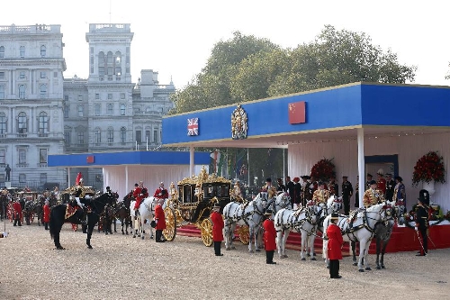 A traditional ceremonial welcome held by British Queen Elizabeth II for visiting Chinese President Xi Jinping is held at the Horse Guards Parade in London, Britain, Oct. 20, 2015. (Xinhua/Rao Aimin) 11
