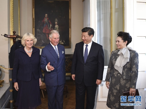 Chinese President Xi Jinping (2nd R) and his wife Peng Liyuan (1st R) meet with British Prince Charles (2nd L) and his wife Camilla,Duchess of Cornwall,in London, Britain, Oct. 20, 2015. (Xinhua/Xie Huanchi)