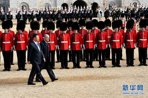 Chinese President Xi Jinping, accompanied by Prince Philip, inspects the guard of honor during a traditional ceremonial welcome held by British Queen Elizabeth II at the Horse Guards Parade in London, Britain, Oct. 20, 2015. (Xinhua/Pang Xinglei)