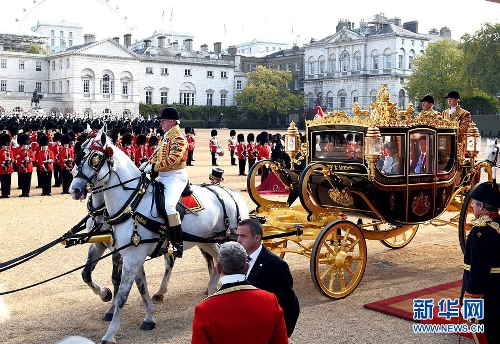 Chinese President Xi Jinping and British Queen Elizabeth II ride a carriage to Buckingham Palace in London, Britain, Oct. 20, 2015. Xi attended a traditional ceremonial welcome held by the Queen at the Horse Guards Parade in London on Tuesday. (Xinhua/Rao Aimin)