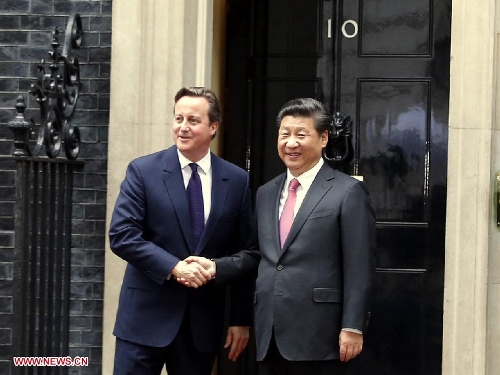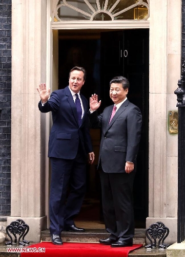Chinese President Xi Jinping (3rd R) holds talks with British Prime Minister David Cameron at 10 Downing Street in London, Britain, Oct. 21, 2015. (Xinhua/Ju Peng)