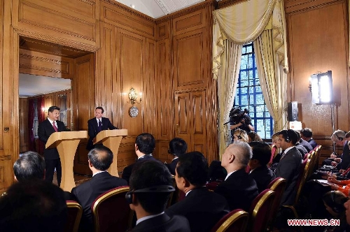 Chinese President Xi Jinping (L, back) and British Prime Minister David Cameron meet media after their talks at 10 Downing Street in London, Britain, Oct. 21, 2015. (Xinhua/Rao Aimin)