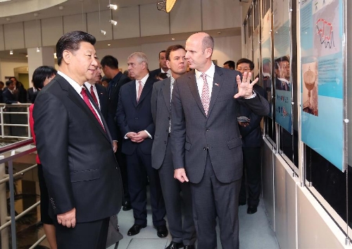 Chinese President Xi Jinping (L, front) visits the Mobile Satellite Company in London, Britain, Oct. 22, 2015. (Xinhua/Yao Dawei)