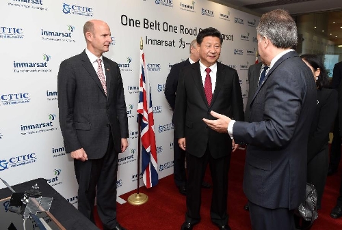 Chinese President Xi Jinping (2nd L) visits the Mobile Satellite Company in London, Britain, Oct. 22, 2015. (Xinhua/Zhang Duo)