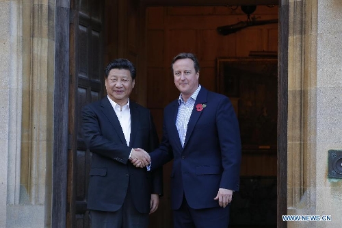 Chinese President Xi Jinping (L) meets with British Prime Minister David Cameron at the latter's country retreat, Chequers, Britain, Oct. 22, 2015.(Xinhua/Rao Aimin)