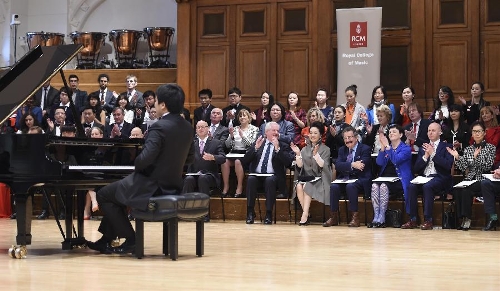 Peng Liyuan (5th R, 1st row), Chinese President Xi Jinping's wife, watches student's performance during a visit to the Royal College of Music in London, Britain, Oct. 22, 2015. (Xinhua/Xie Huanchi)