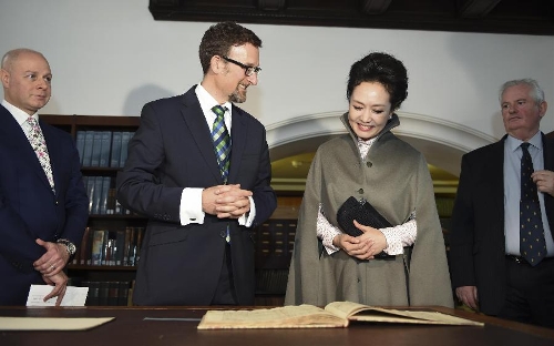 Peng Liyuan (2nd R), Chinese President Xi Jinping's wife, views a music script during a visit to the Royal College of Music in London, Britain, Oct. 22, 2015. (Xinhua/Xie Huanchi)