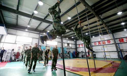 Climbing poles with bare hands is also part of the training. Photo: Cui Meng/GT