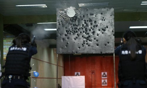 A female officer takes aim at a flying target. Photo: Cui Meng/GT