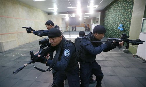 Members of the Special Police Force take target practice at a training base in Urumqi. Photo: Cui Meng/GT