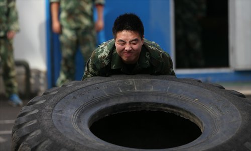 A member of the Special Police Force lifts a tire at a training base in Urumqi. Photo: Cui Meng/GT