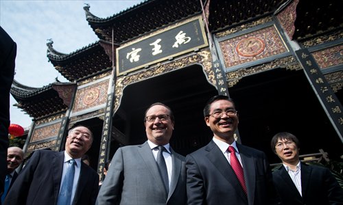 French President Francois Hollande poses with Chongqing mayor Huang Qifan (left) during a Huguang Guild Hall tour in Chongqing on Monday. Hollande hopes to persuade China, a key country in the fight against global warming, to give a decisive push to negotiations ahead of a key climate conference in Paris. Photo: AFP