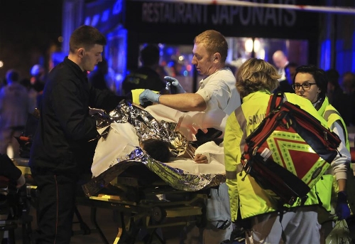 Wounded people are evacuated outside the scene of a hostage situation at the Bataclan theatre in Paris, 13 November 2015. (Xinhua/AP Photo)
