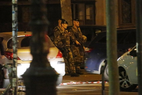 Soldiers patrol near the Bataclan theater in Paris, Friday Nov. 13, 2015. (Xinhua/AP Photo)