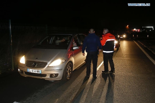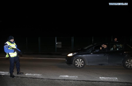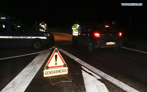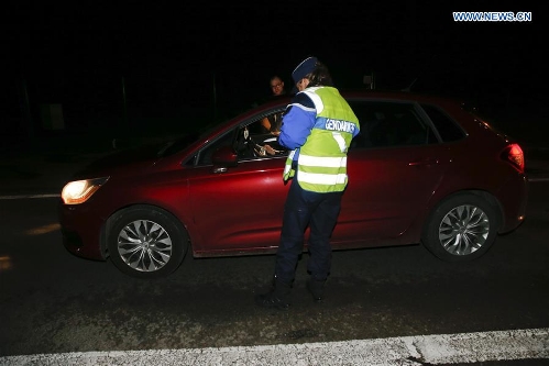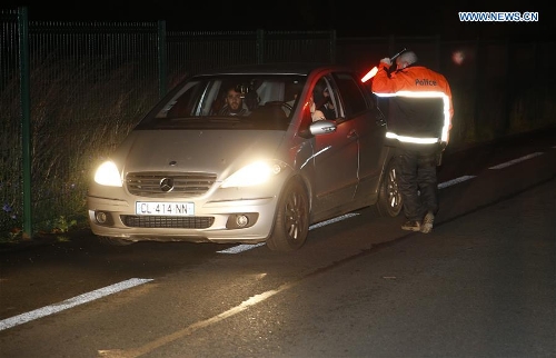 Belgian policemen check cars entering France at Belgian border city Bettignies, Nov. 14, 2015. Over 100 people have been reportedly killed and many more wounded in a series of what appear to be coordinated attacks across Paris late Friday. (Xinhua/Ye Pingfan)