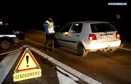 French policemen check cars leaving France at Belgian border city Bettignies, Nov. 14, 2015. Over 100 people have been reportedly killed and many more wounded in a series of what appear to be coordinated attacks across Paris late Friday. (Xinhua/Ye Pingfan)