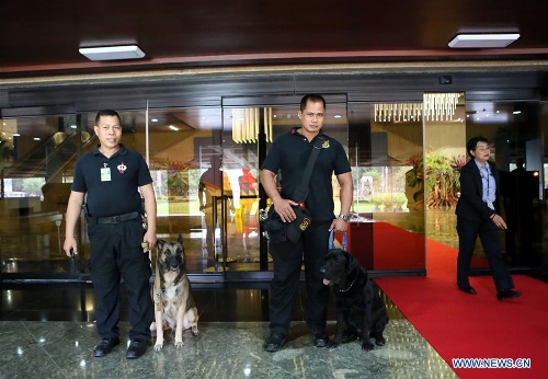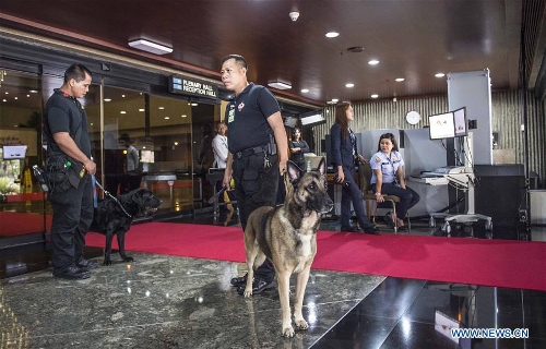 Policemen use dogs to check the venue of the Asia-Pacific Economic Cooperation (APEC) Leaders' Meeting in Manila, Philippines, on Nov. 14, 2015. Security measures in Manila, especially around the Asia-Pacific Economic Cooperation (APEC) Leaders' Meeting venues, were tightened on Saturday following terror attacks in Paris that killed at least 153 people. (Xinhua/Lui Siu Wai)