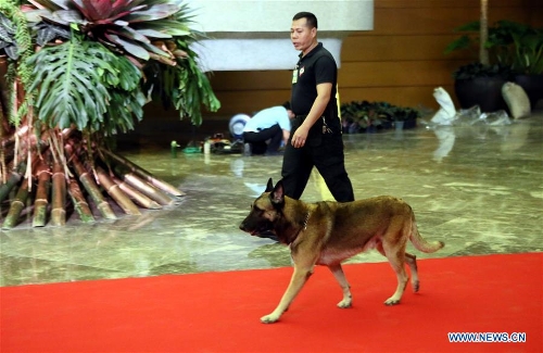 A policeman uses a dog to check the venue of the Asia-Pacific Economic Cooperation (APEC) Leaders' Meeting in Manila, Philippines, on Nov. 14, 2015. Security measures in Manila, especially around the Asia-Pacific Economic Cooperation (APEC) Leaders' Meeting venues, were tightened on Saturday following terror attacks in Paris that killed at least 153 people. (Xinhua/Li Peng)