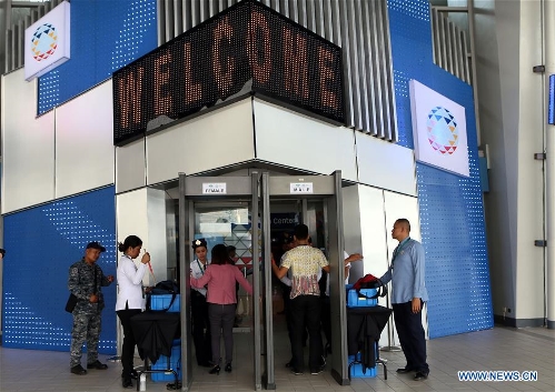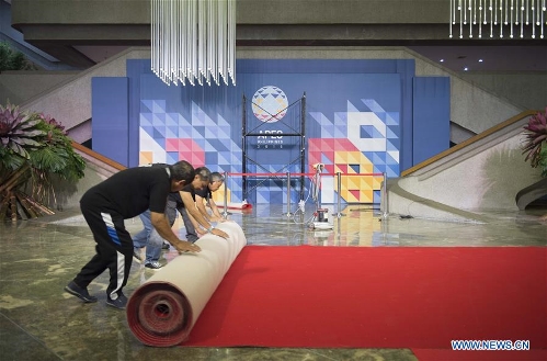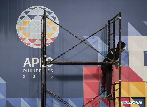 Staff members work at the venue of the Asia-Pacific Economic Cooperation (APEC) Leaders' Meeting in Manila, Philippines, on Nov. 14, 2015. Security measures in Manila, especially around the Asia-Pacific Economic Cooperation (APEC) Leaders' Meeting venues, were tightened on Saturday following terror attacks in Paris that killed at least 153 people. (Xinhua/Lui Siu Wai)