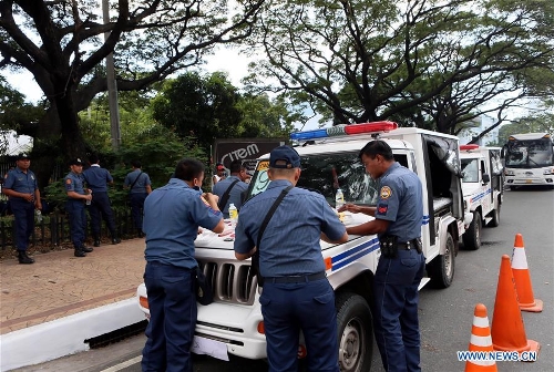 Special policemen patrol near the venue of the Asia-Pacific Economic Cooperation (APEC) Leaders' Meeting in Manila, Philippines, on Nov. 14, 2015. Security measures in Manila, especially around the Asia-Pacific Economic Cooperation (APEC) Leaders' Meeting venues, were tightened on Saturday following terror attacks in Paris that killed at least 153 people. (Xinhua/Lui Siu Wai)