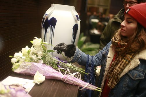 A woman places flowers in the French Embassy in Beijing on November 16, 2015. Photo: Li Hao/GT