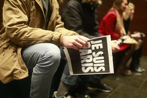 People hold slogans bearing words of support to Paris in front of the French Embassy in Beijing on November 16, 2015. Photo: Li Hao/GT