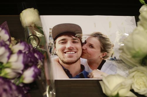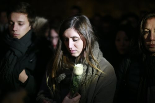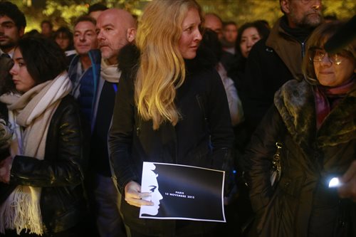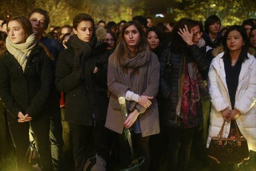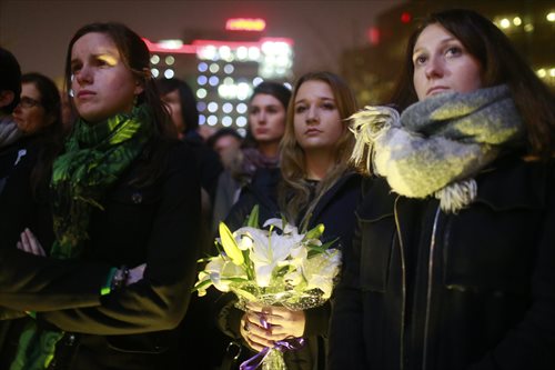 Mourners pray in front of the French Embassy in Beijing on November 16, 2015. Photo: Li Hao/GT