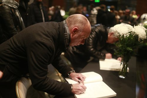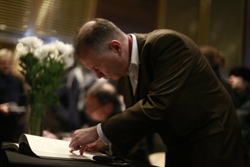 People sign their names and leave messages on registries in the French Embassy in Beijing on November 16, 2015. Photo: Li Hao/GT