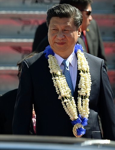 Chinese President Xi Jinping wears a garland after being welcomed upon his arrival at the Manila international airport ahead of the Asia-Pacific Economic Cooperation meeting in Manila on Tuesday. Asia-Pacific leaders arrived in the Philippines on Tuesday for a meeting meant to foster trade unity. Photo: AFP