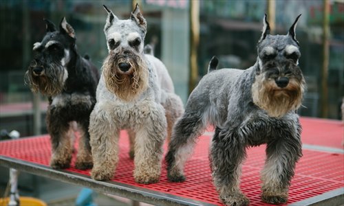 Schnauzers being showcased at the entrance of the Liyuan Dog Market in Tongzhou district. Photo: Li Hao/GT