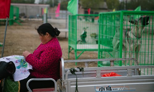 A dog vendor embroiders to pass the time at the new dog market. Photo: Li Hao/GT