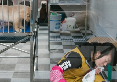 A shop owner at the Liyuan Dog Market cleans a stall on Tuesday. Photo: Li Hao/GT