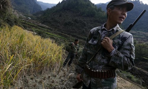 Hunter Liu Dekun enters the forest on October 14. When hunting, he is on high alert. Photo: CFP