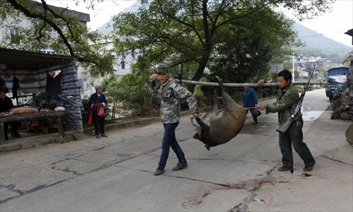 Two hunters carry a large boar. Photo: CFP