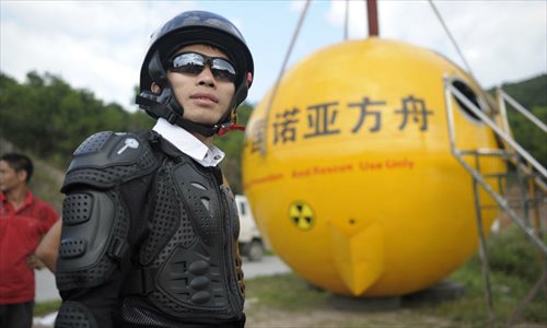 Chinese businessman Yang Zongfu stands in front of a Noah's Ark survival pod, which he spent two years and about 1.5 million yuan making. He says it will combat extreme weather and natural disasters.