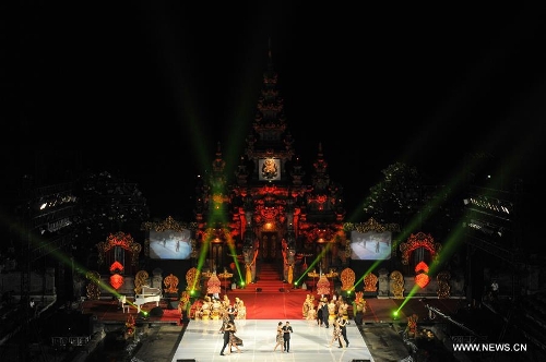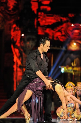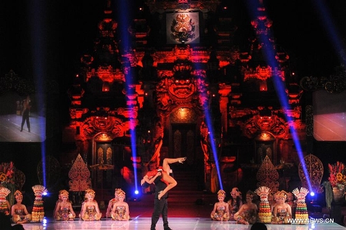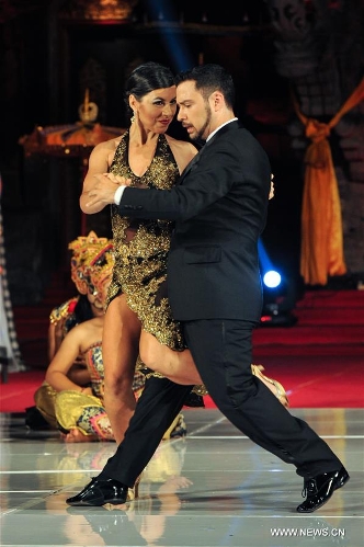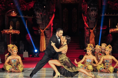 Tango dancers Ezequiel Paludi and Geraldine Rojas perform during the Tango in Paradise Festival at Denpasar in Bali, Indonesia, Nov. 28, 2015. Tango in Paradise Festival is an unique Tango festival that combines Tango with Indonesian traditional culture. This year, one of the traditional fabrics from Bali "Saput Poleng Bali" (a cloth with checkered pattern of black and white) will be the icon of the festival. (Xinhua/Veri Sanovri)