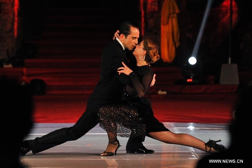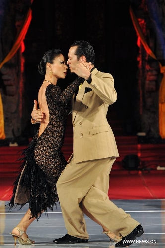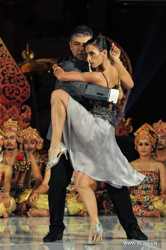 Tango dancers Julio Balmaceda (L) and Virginia Vasconi perform during the Tango in Paradise Festival at Denpasar in Bali, Indonesia, Nov. 28, 2015. Tango in Paradise Festival is an unique Tango festival that combines Tango with Indonesian traditional culture. This year, one of the traditional fabrics from Bali "Saput Poleng Bali" (a cloth with checkered pattern of black and white) will be the icon of the festival. (Xinhua/Veri Sanovri)