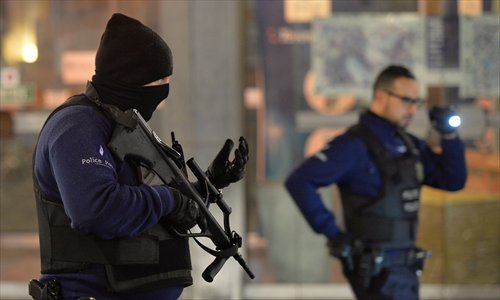 Belgian police officers secure an area as a reported police intervention takes place around the Grand Place central square in Brussels. Photo: IC