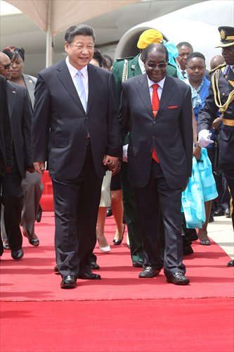 Chinese President Xi Jinping and Zimbabwean President Robert Mugabe hold hands upon Xi's arrival in Harare, Zimbabwe on Tuesday. Xi is in Zimbabwe for a two-day visit during which he is set to sign some bilateral agreements aimed at strengthening relations between the two countries. Photo: AP