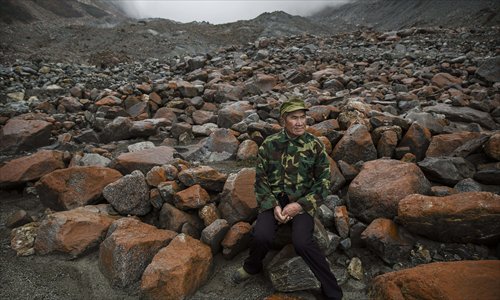 Villager Li Yuanqing, 62, who has witnessed the ice slowly receding, rests his hand on a rope as he pauses near the headwaters of the Glacier River and the end of the tongue of Glacier 1. Photo: CFP