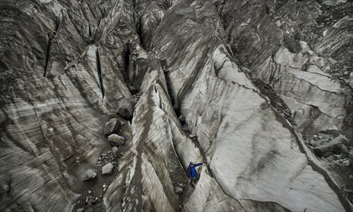 A glacier researcher walks on the ice tongue. Photo: CFP