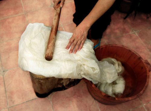 Raw silk has to be pressed before being processed. Photo: Courtesy of the Ancient Chinese Clothing Restoration Team