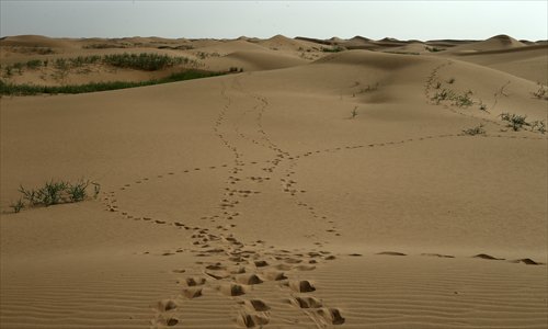Footsteps of camels are left in the desert sand. Photo: CFP